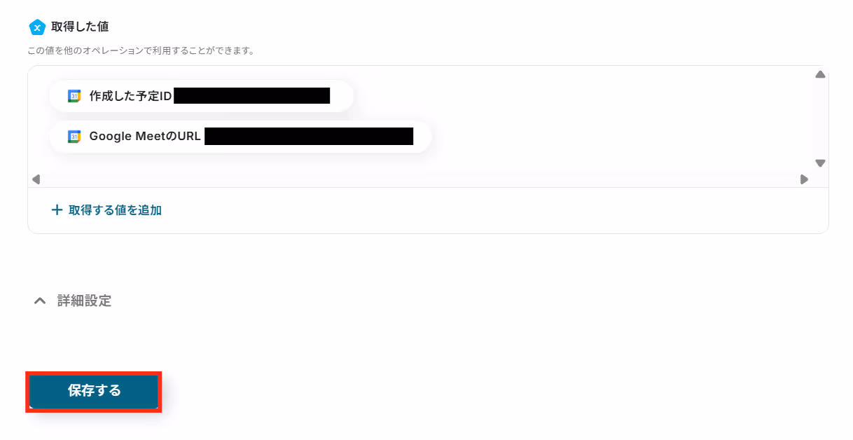 テスト結果に問題がなければ画面下の保存するボタンクリックし、Googleカレンダーへ予定を作成する設定を完了させてください。