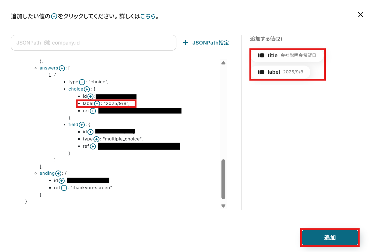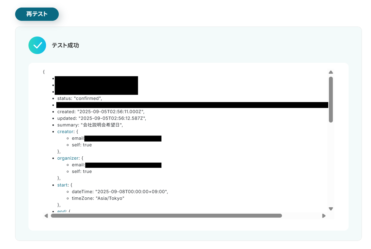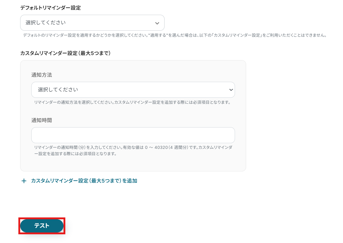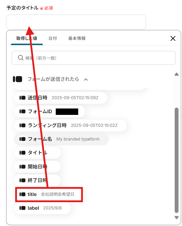 - Googleカレンダーで作成する予定のタイトル、日時、説明などを任意で設定してください。Typeformの回答内容を引用して、動的に予定を作成することも可能です