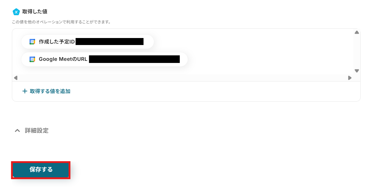 - Google Meetの会議スペースをGoogleカレンダーの予定と紐付けたい場合は、「会議スペースを作成」アクションの代わりにGoogleカレンダーの「予定を作成」アクションを使用することで、会議URLを発行できます。