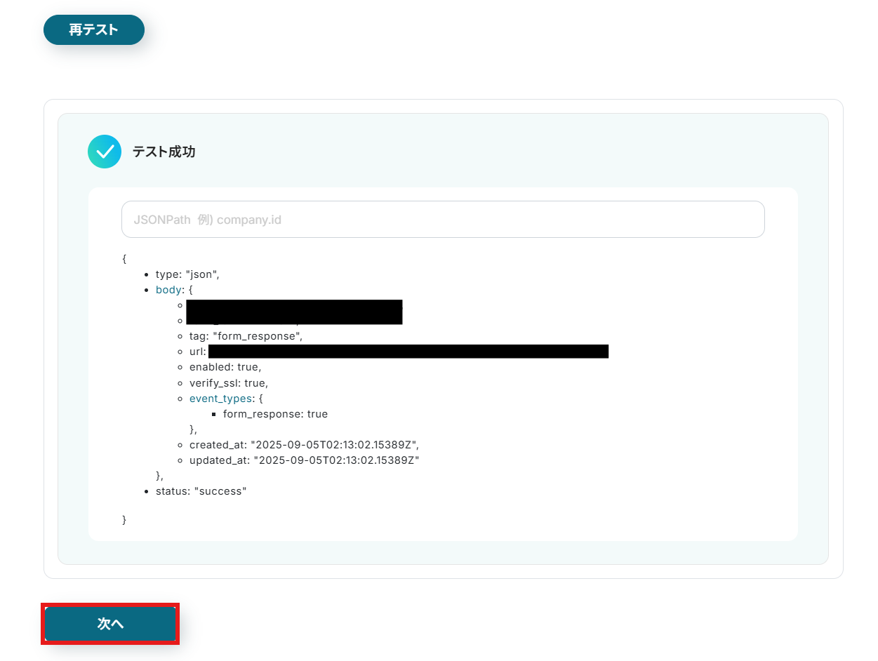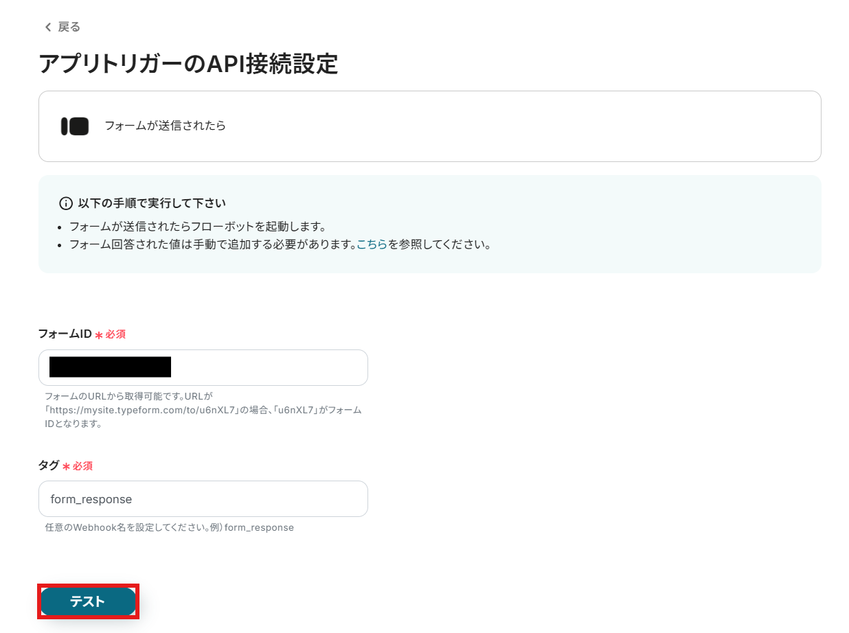 - タグ:任意の値を設定してください。わからなければ注意書きにも記載されている「form_response」を設定しましょう。