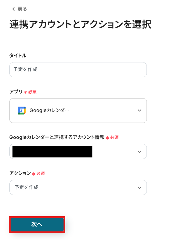 「連携アカウントとアクションを選択」画面では以下を設定します。
