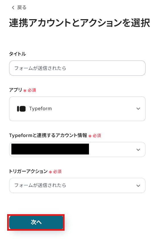 - Typeformのトリガー設定では、自動化の対象としたいフォームを任意で設定してください。
