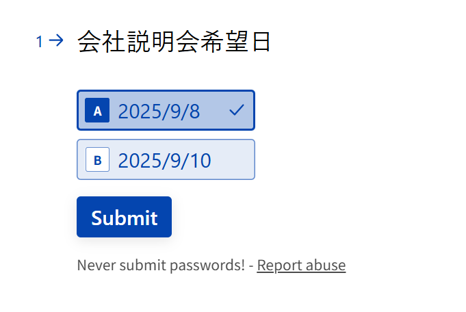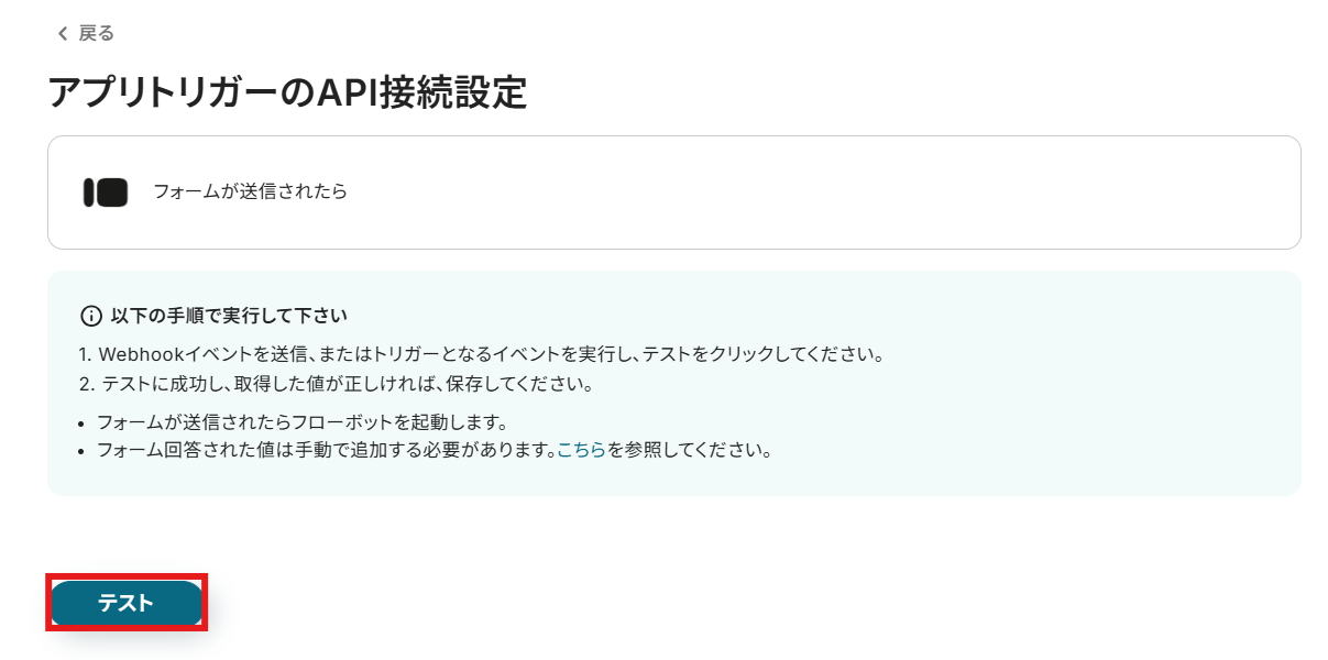 次の画面のテストでフォームの回答結果を取得するため、先ほど作成したフォームに回答を送信してください。