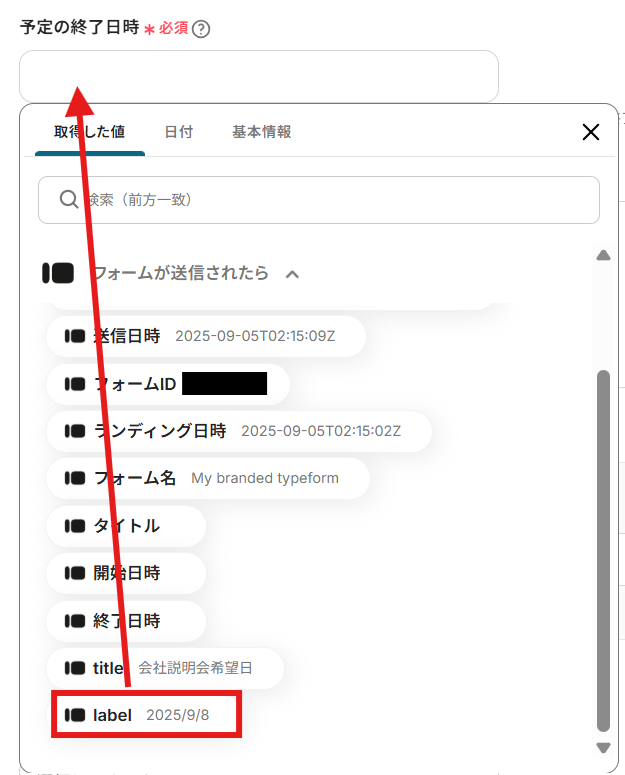 - 予定の開始日時、予定の終了日時:1つ前のステップで取得した日時をプルダウンより設定してください。