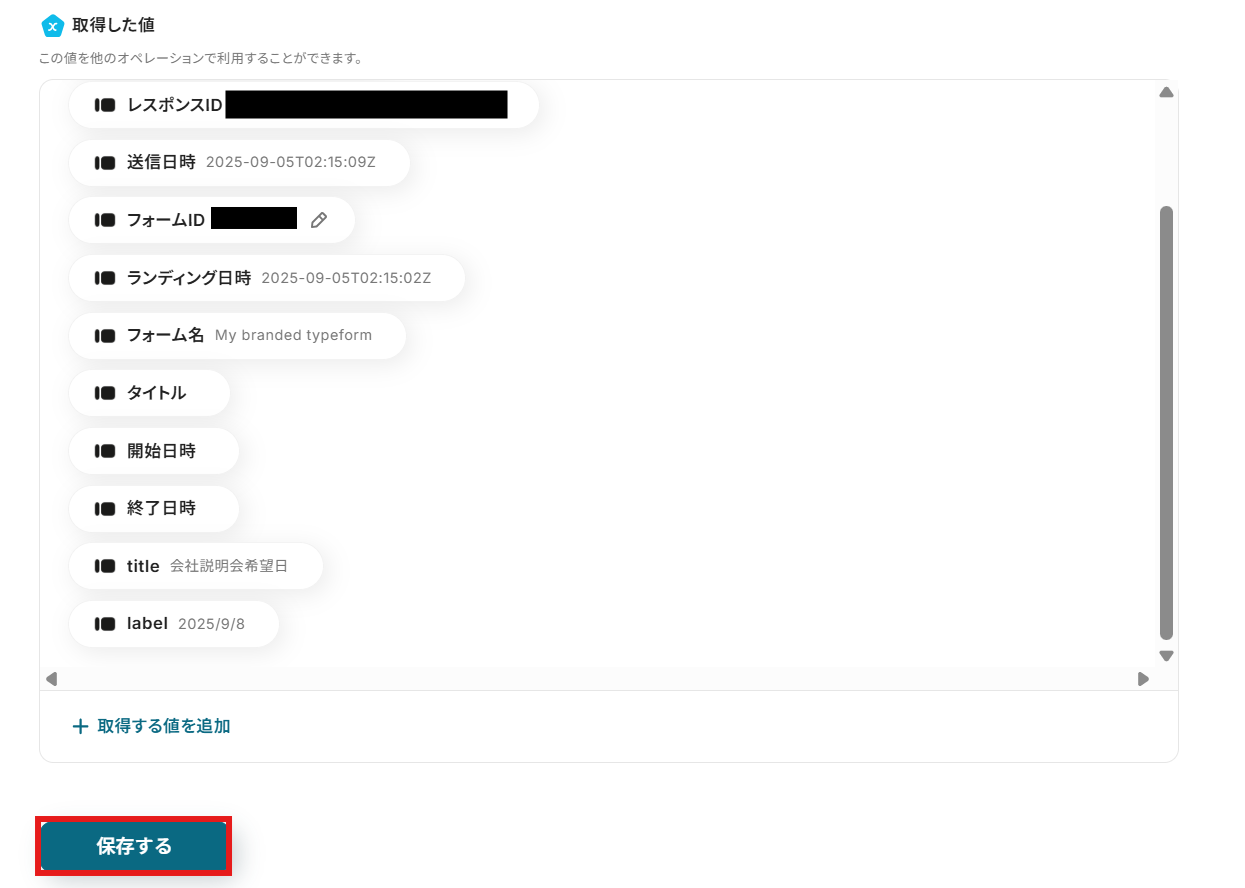 取得した情報より、回答した選択肢を取得するために「取得する値を追加」をクリックしてください。