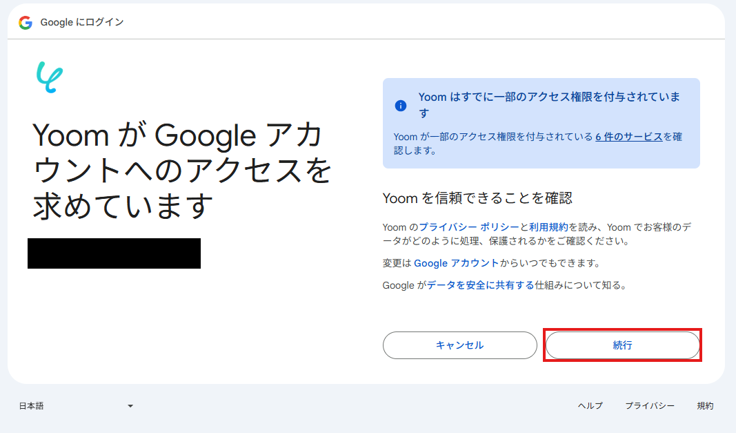 ログインするとYoomとの連携を求める下記の画面が表示されます。