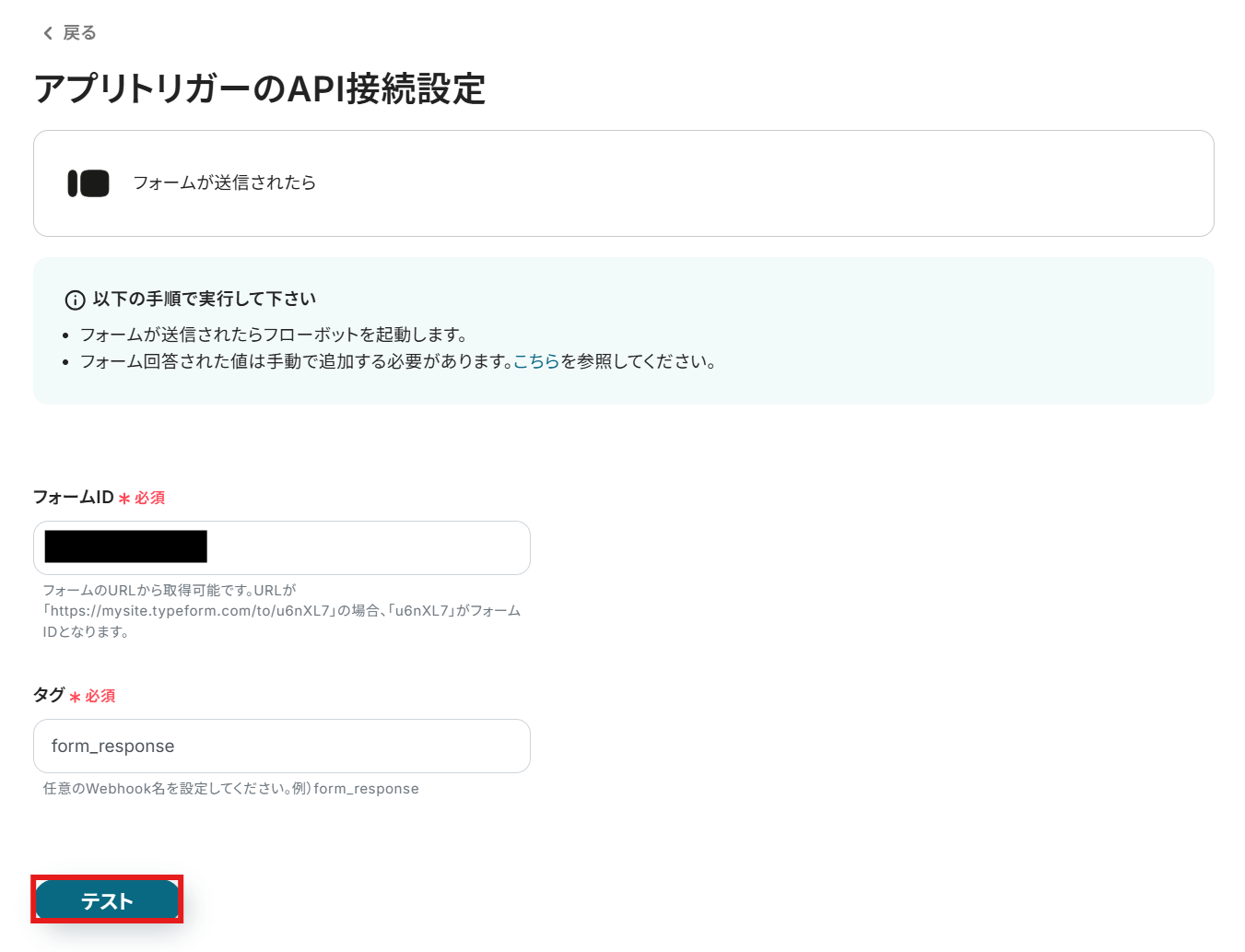 - タグ:任意の値を設定してください。わからなければ注意書きにも記載されている「form_response」を設定しましょう。