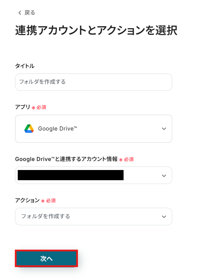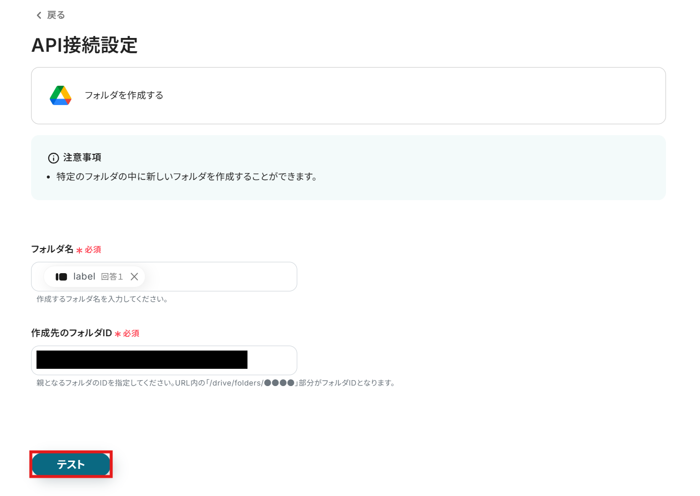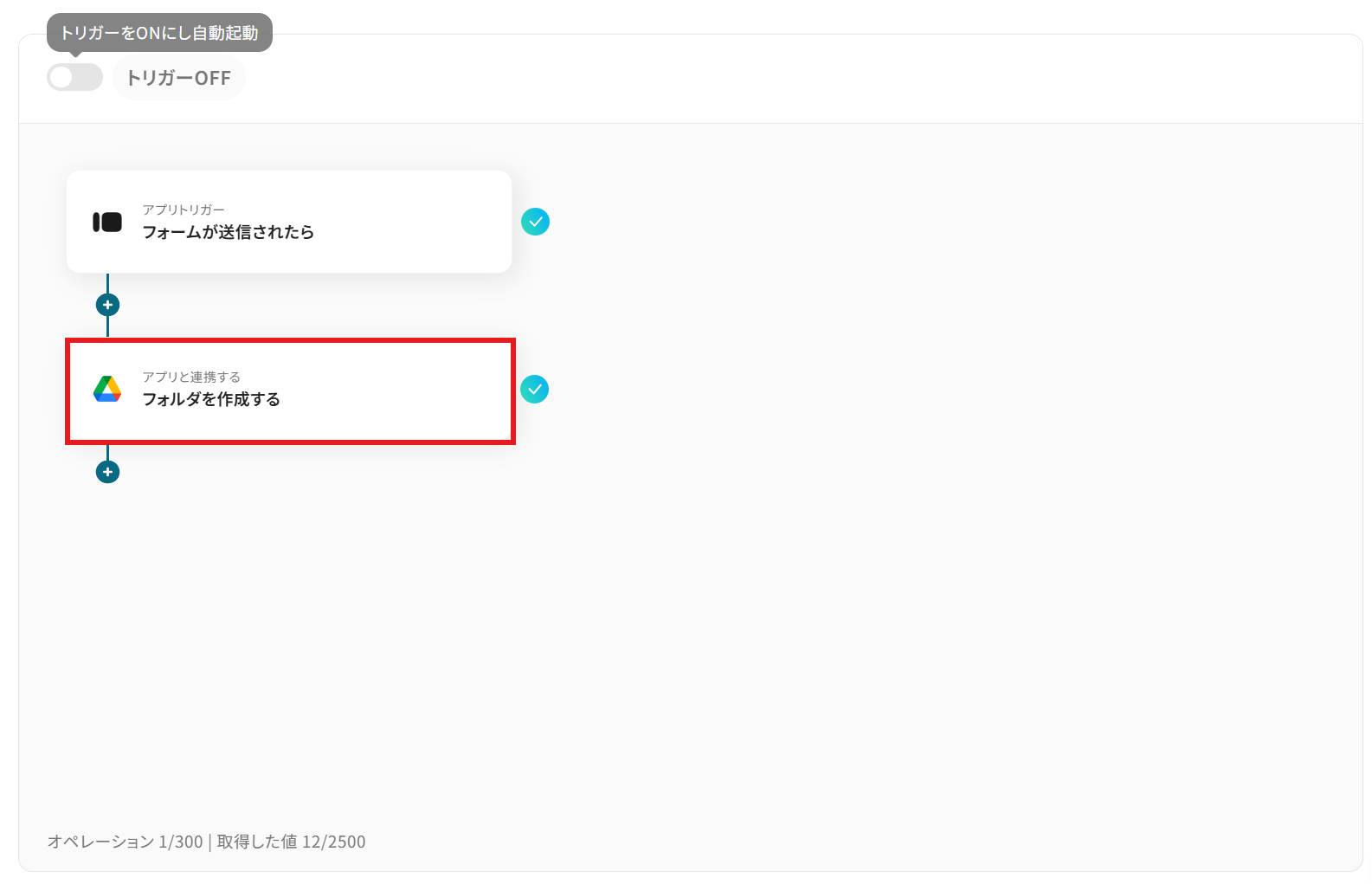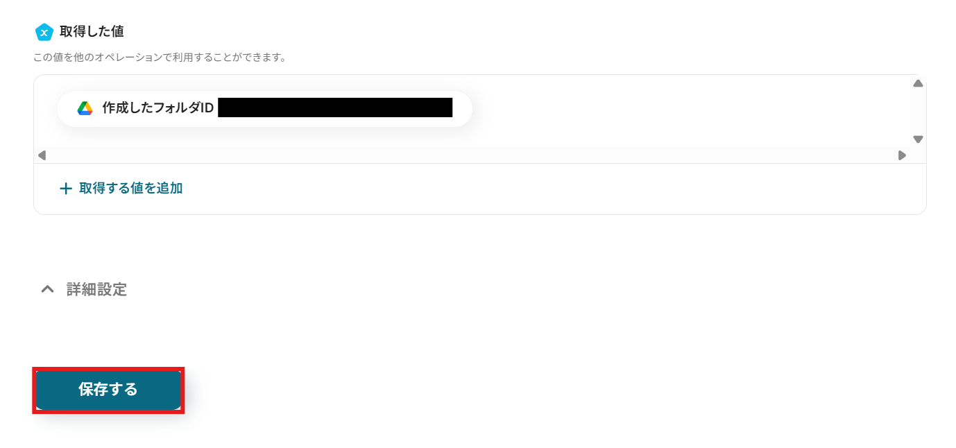 次にGoogle Driveにフォルダを作成する設定を行います。画面赤枠の「フォルダを作成する」をクリックしてください。