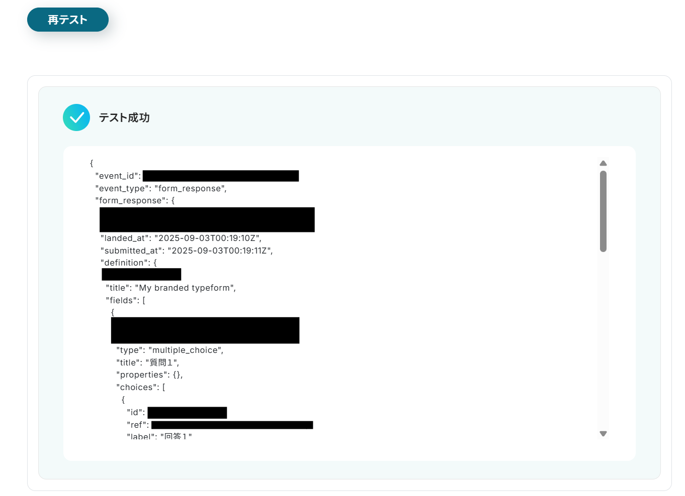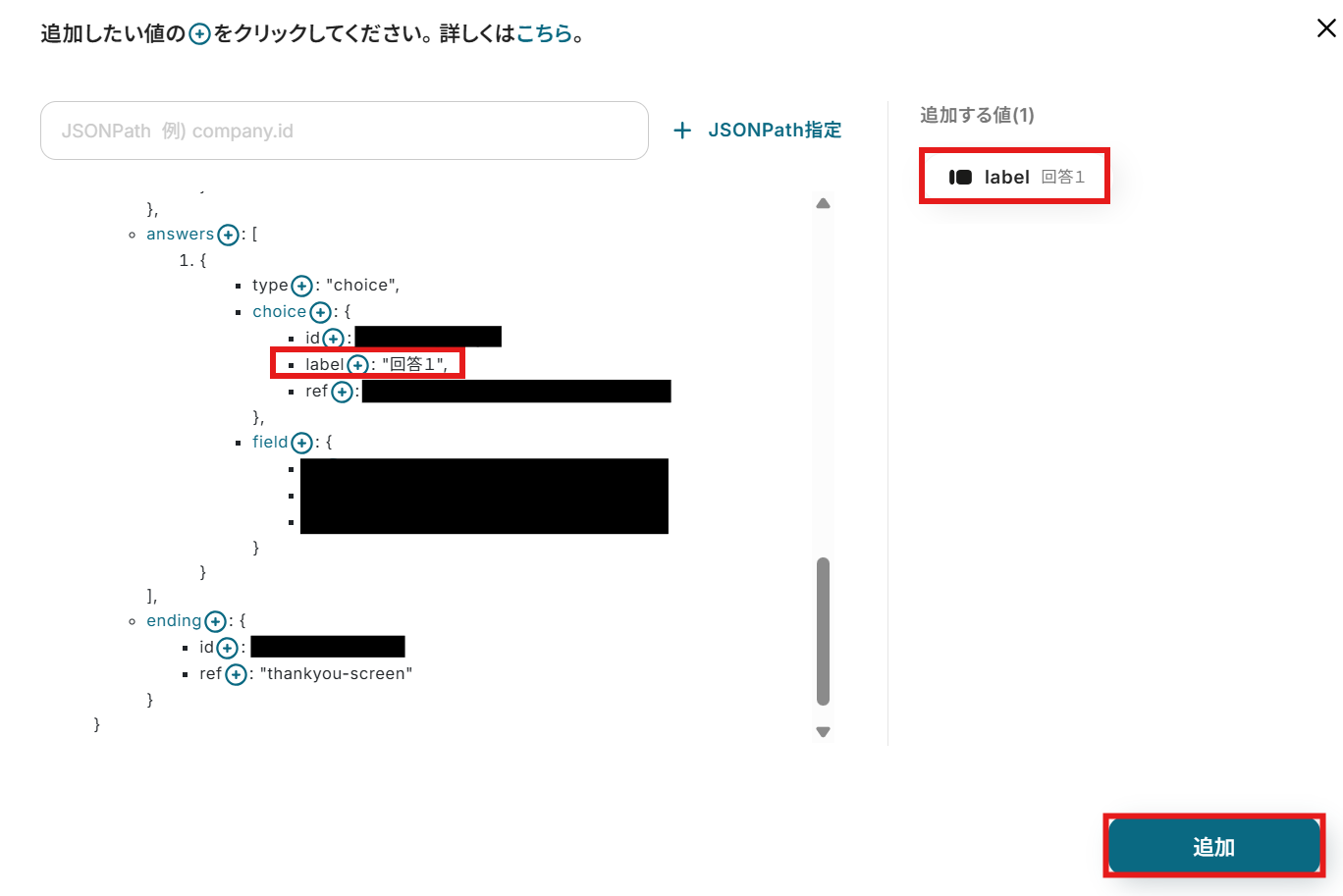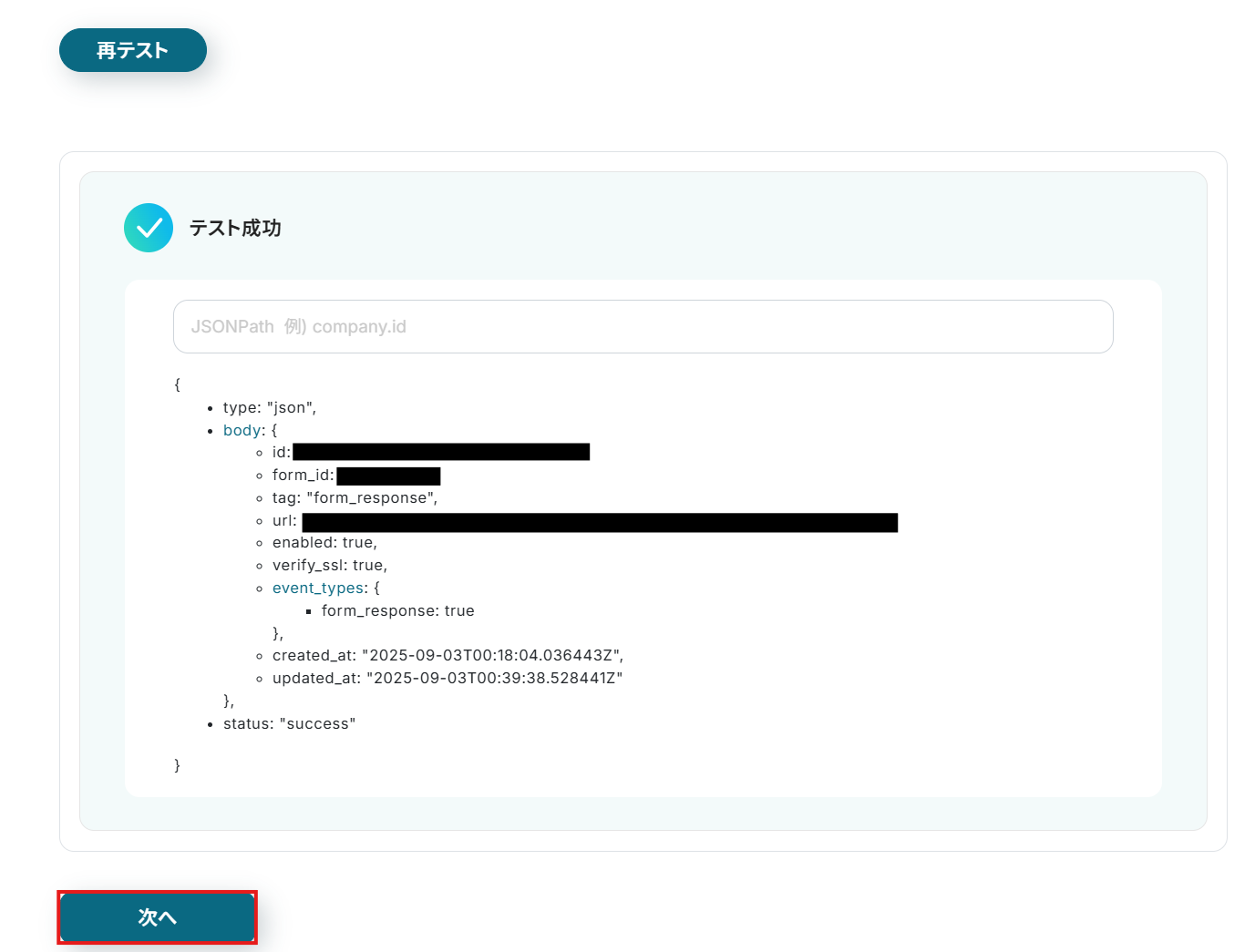 ・TypeformのアウトプットはJSONPathから取得可能です。取得方法は下記をご参照ください。