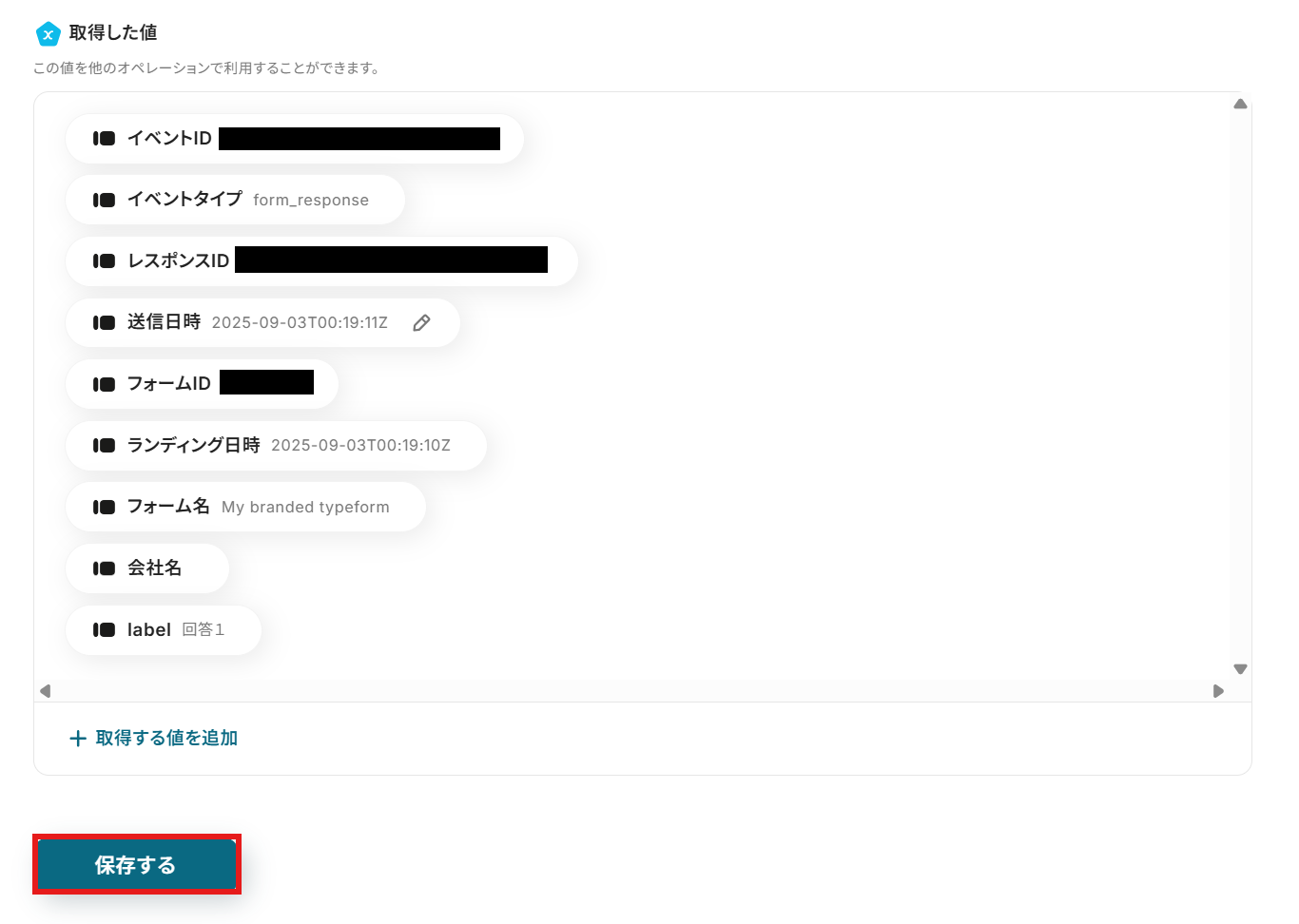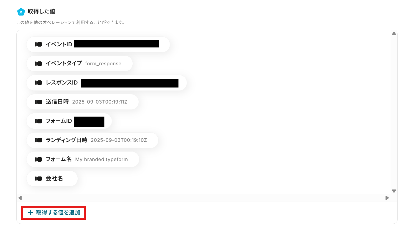 取得した情報より、回答した選択肢を取得するために「取得する値を追加」をクリックしてください。