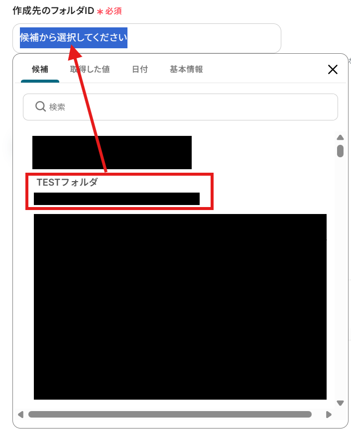 - アクション:プルダウンより設定可能です。今回はデフォルトで設定されている項目(フォルダを作成する)のまま進みましょう。