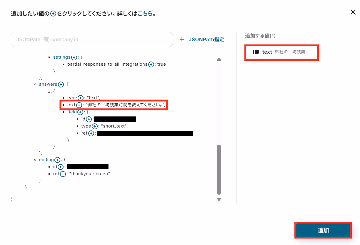 下記ウィンドウが表示されたらanswersの中のtextの+ボタンをクリックしてください。この取得した文章をのちにGoogle スプレッドシートに反映していきます。