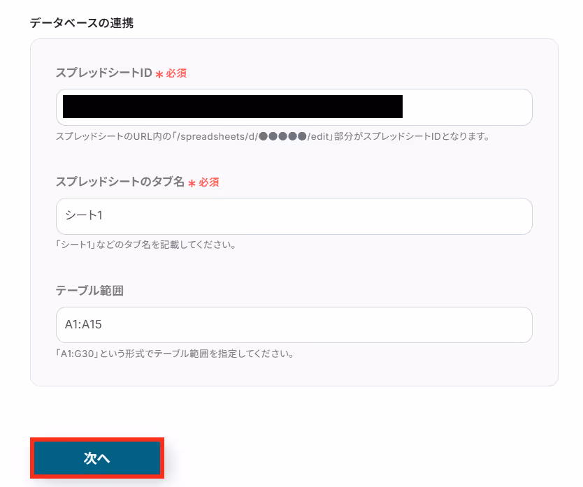 Yoomの画面に戻り、作成したGoogle スプレッドシートをもとにデータベースの連携を入力していきましょう。