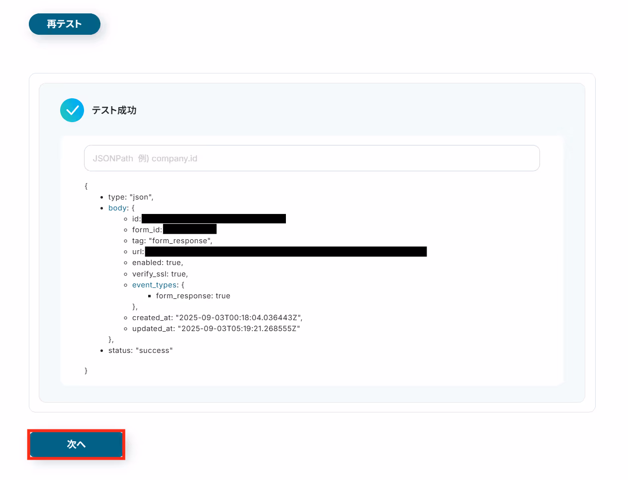テスト成功が表示されたら次へボタンをクリックしましょう。