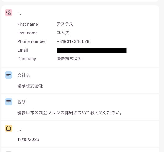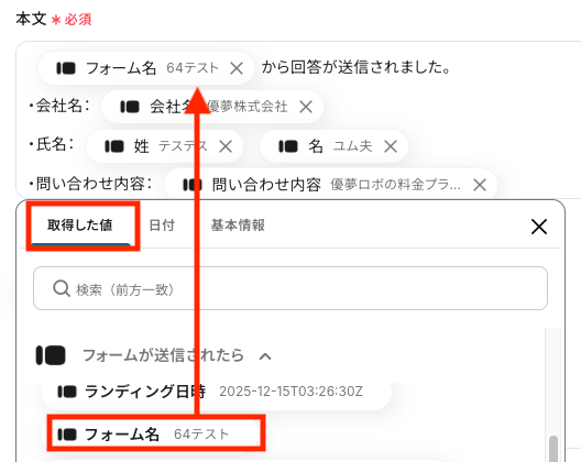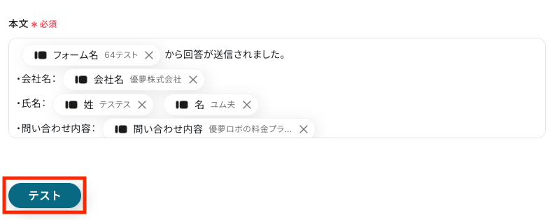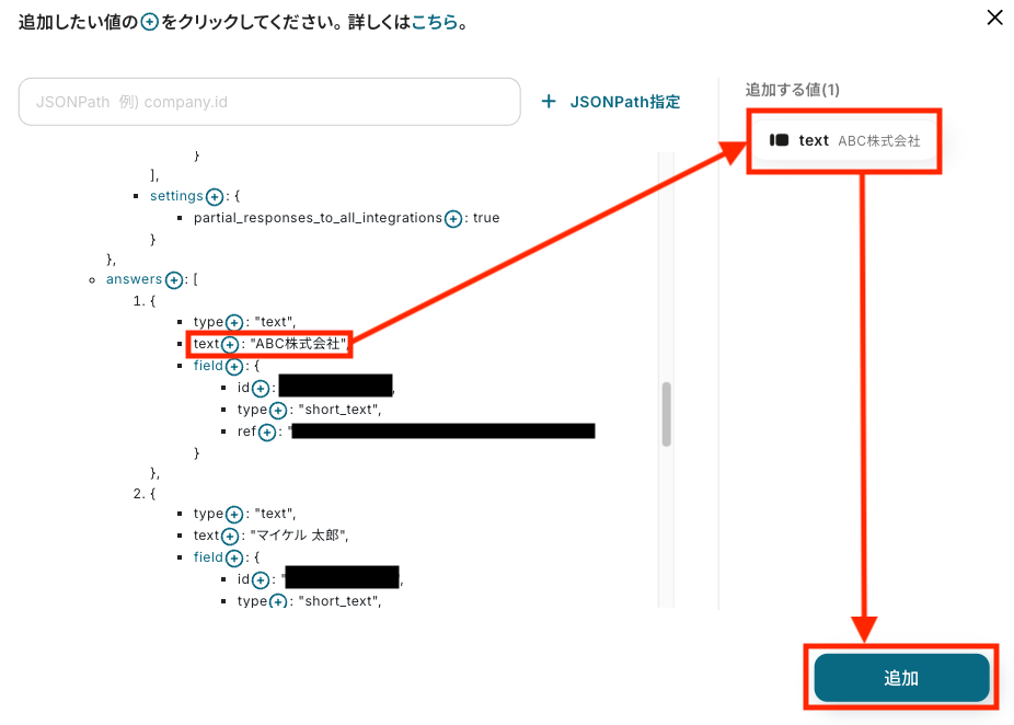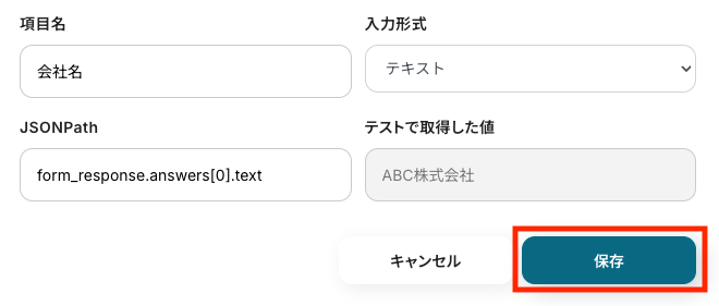 ここでは例として、Typeformに送信された会社名を追加してみます。