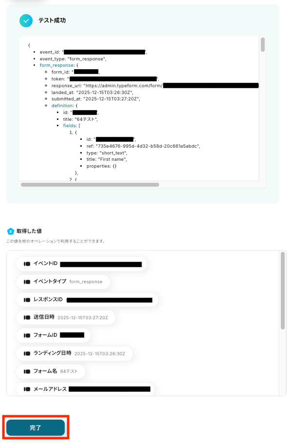 事前に用意しておいたTypeformに、テスト用の回答を送信してください。