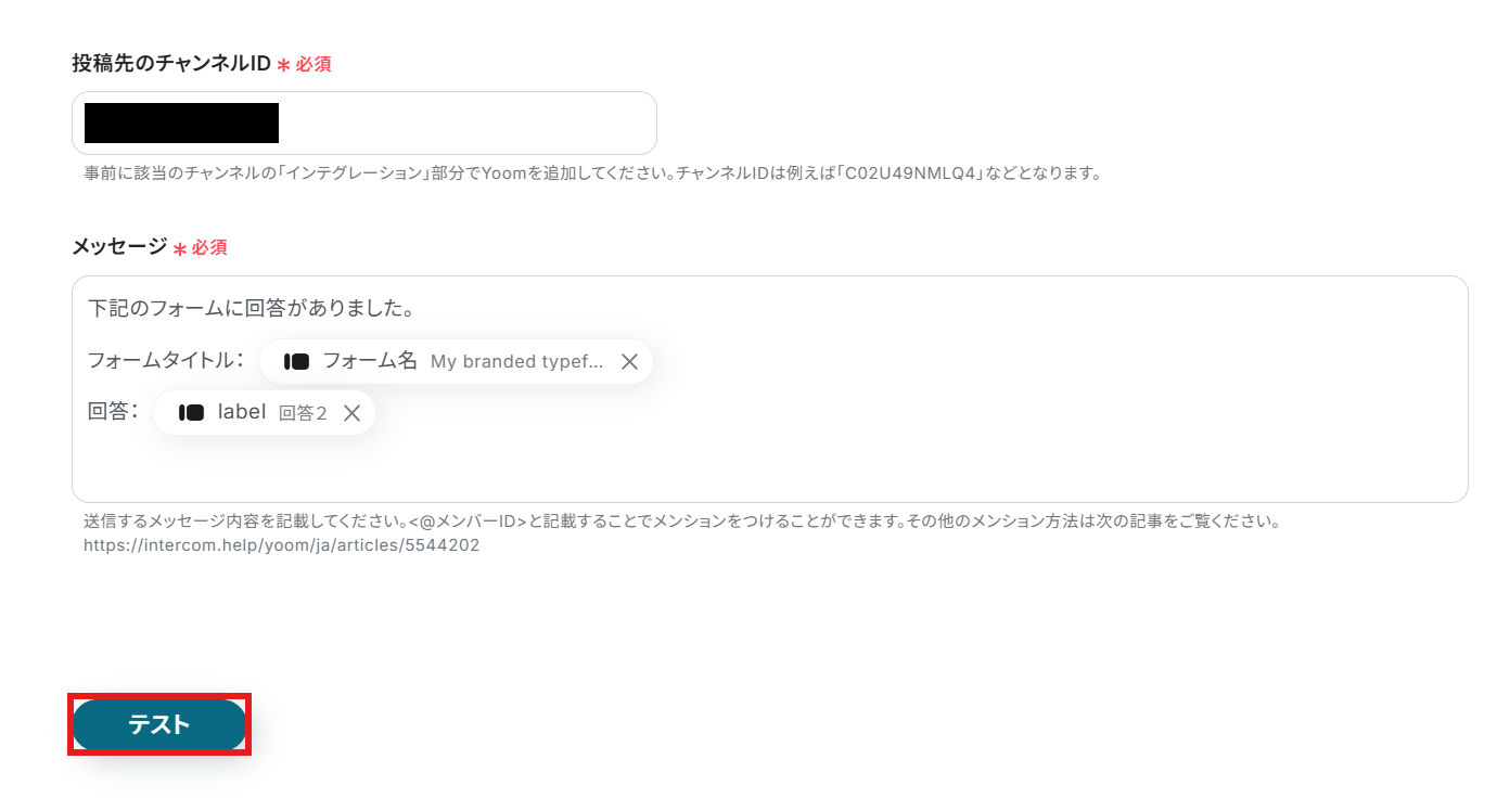 設定が完了したらテストボタンをクリックしましょう。(※実際にSlackにメッセージが送信されます。必要に応じてメンバーに周知などを行ってください。)