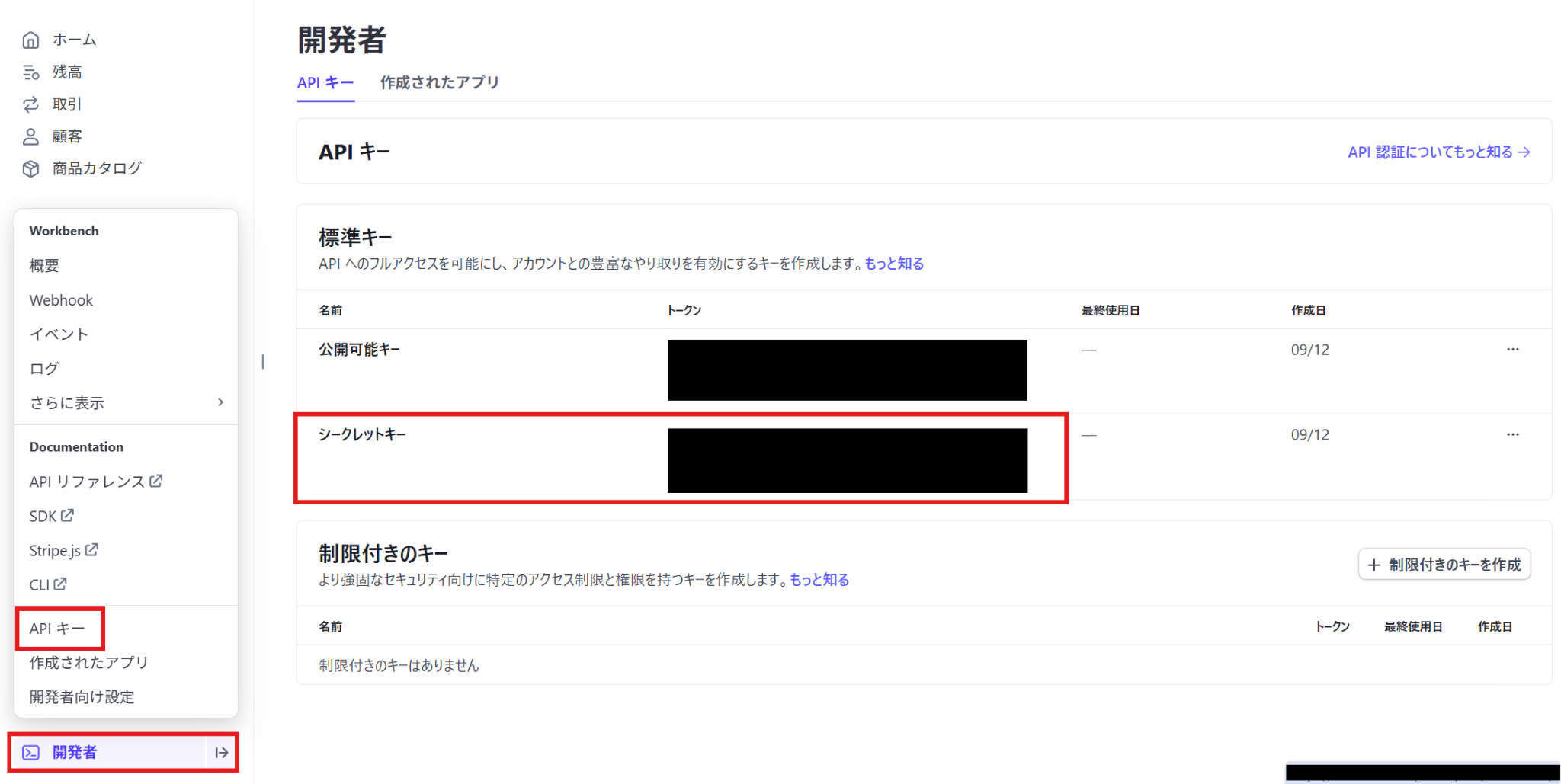 下記の画面のようにStripeからシークレットキーを取得できます。