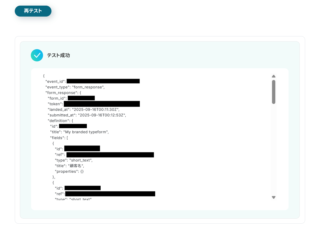 テスト成功が表示されたら、回答の取得完了となります。