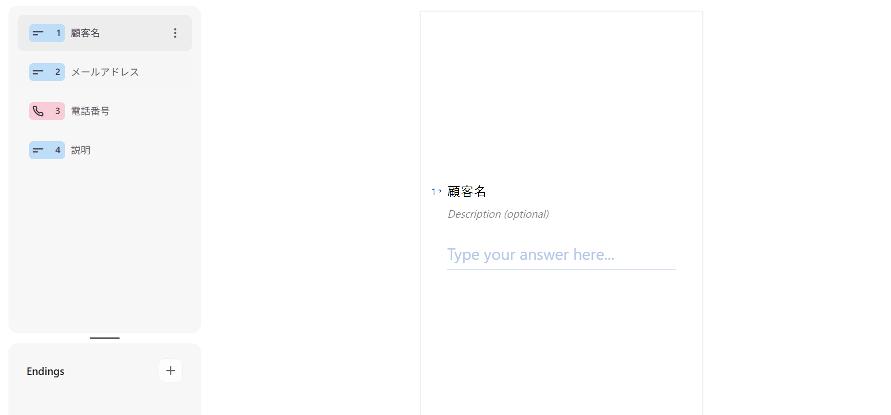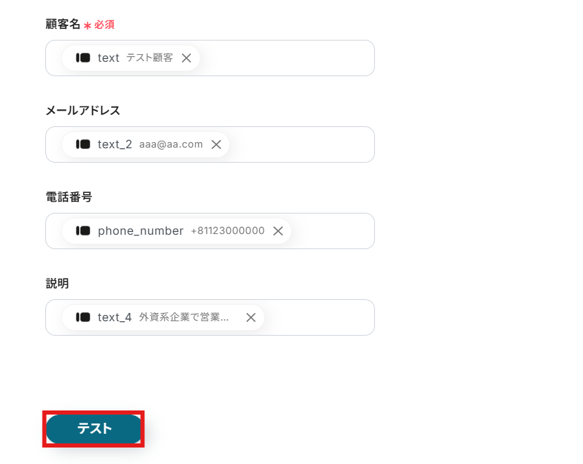 今回は下記のように顧客名、メールアドレス、電話番号、説明(備考)を入力するフォームを作成して進めています。
