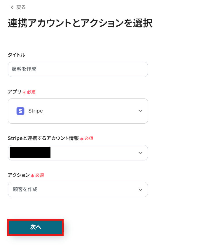 「連携アカウントとアクションを選択」画面では以下を設定します。