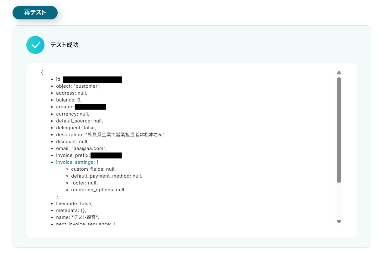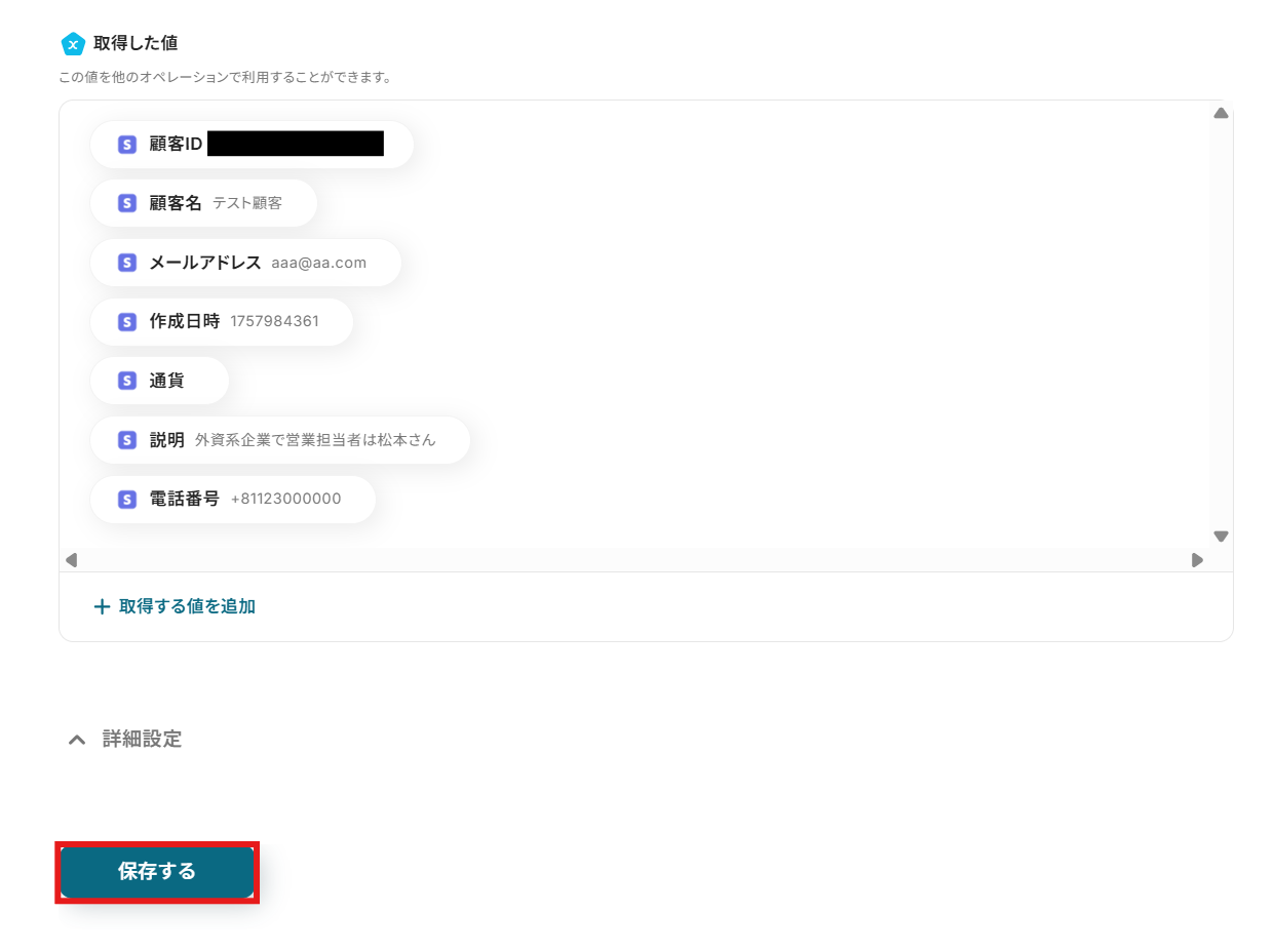 他にも「請求書情報を取得」や「サブスクリプションを作成」等のアクションなどが選択できるため、必要に応じて使い分けてください。