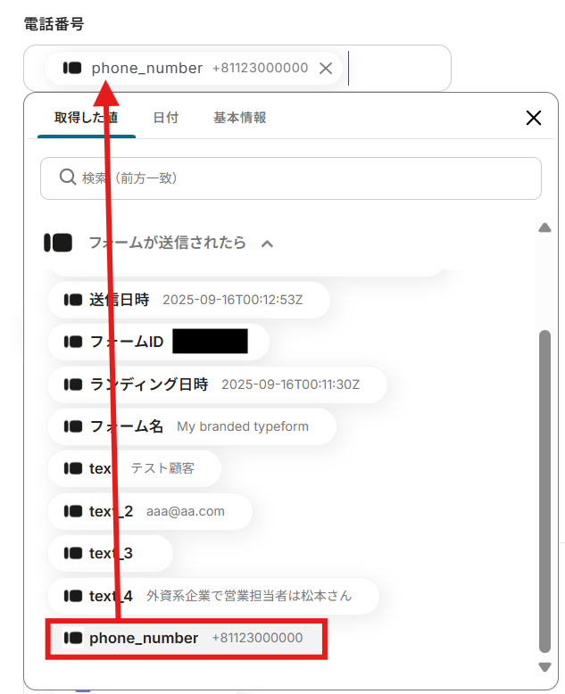 取得した値を確認すると電話番号のみ取得ができていないことが分かります。