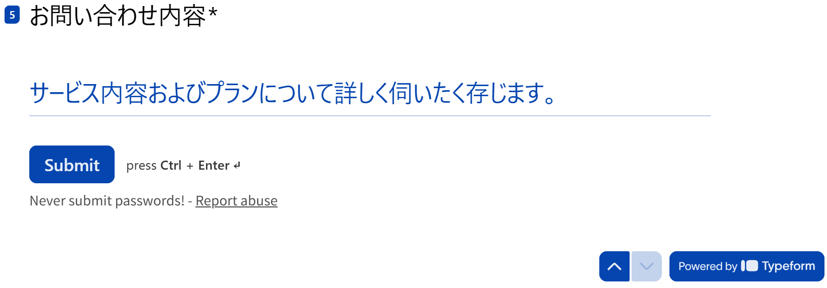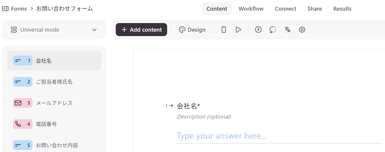 ここまできたら一旦Typeformに移り、テスト用フォームを作成しましょう。 今回は例として、問い合わせフォームを作成しました。
