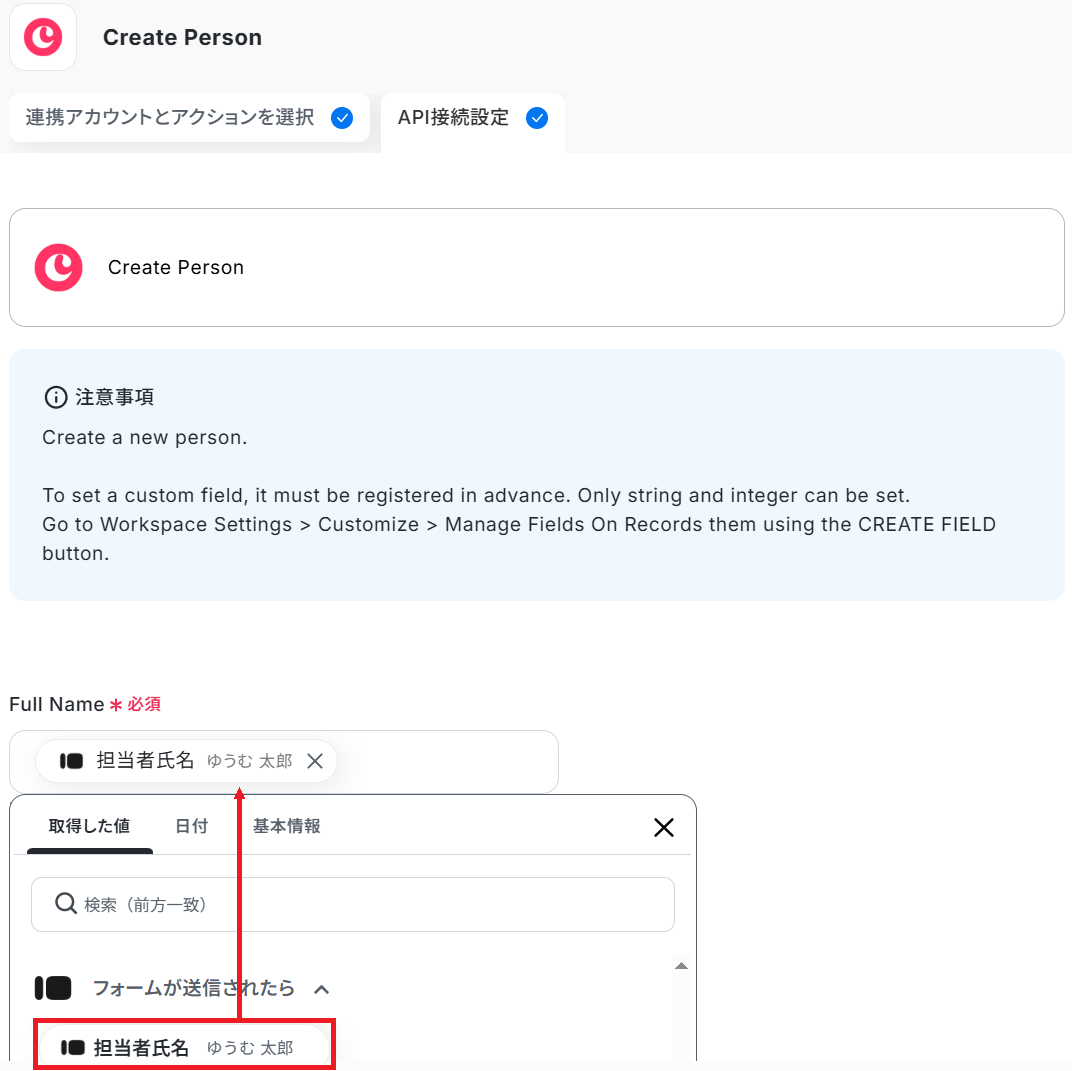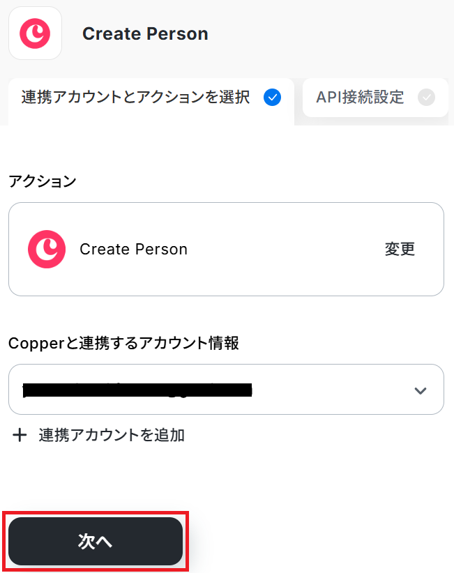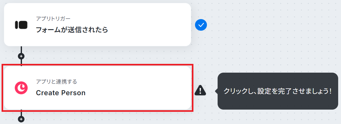 ステップ4:Copperのアクション設定 先ほど取得した回答内容をもとにPersonを作成します。 「Create Person」をクリックしてください。