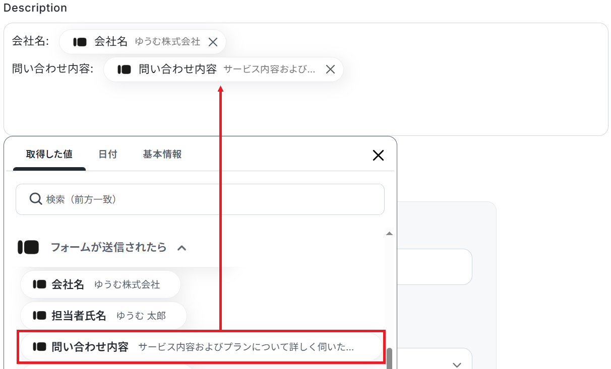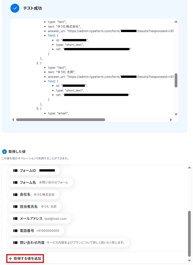 なお、取得した値に取得したい項目が反映されていないことがあります。 その場合「+ 取得する値を追加」から項目を追加可能です。「取得する値」を追加する方法