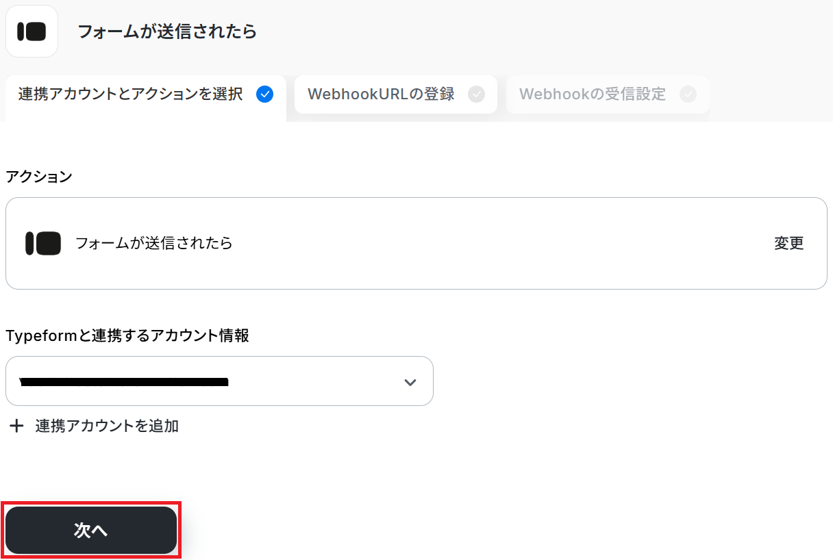 タイトル と連携するアカウント情報 を任意で設定し、アクションはテンプレート通りに「フォームが送信されたら」のまま「次へ」をクリックします。