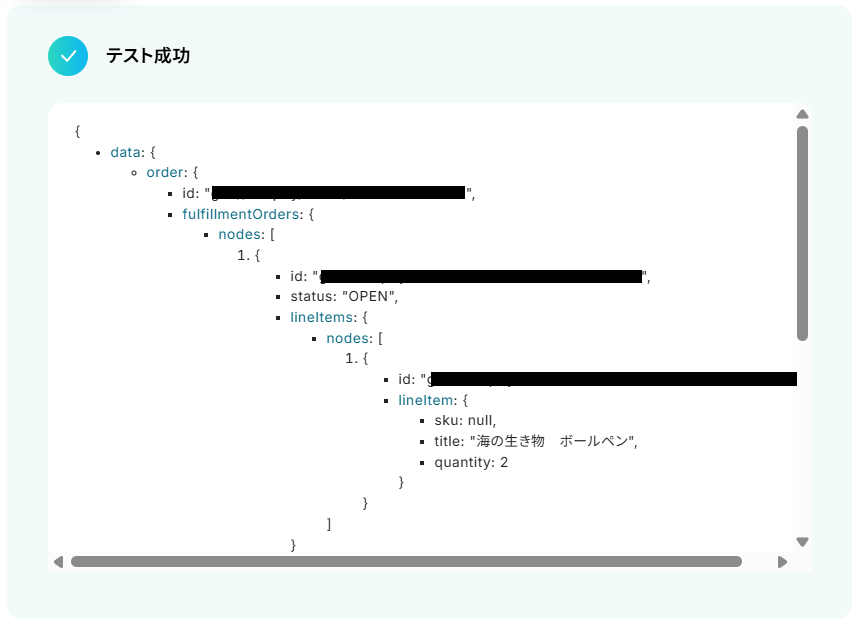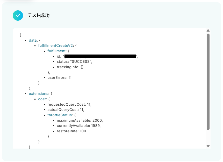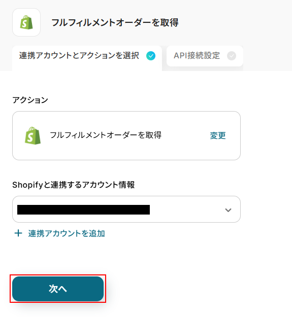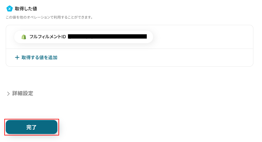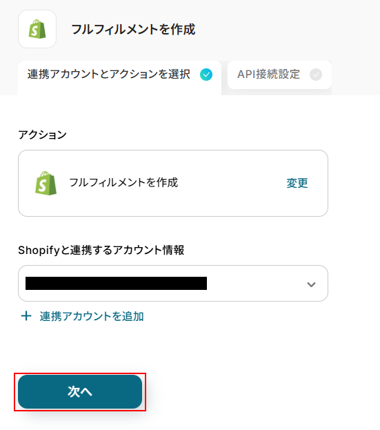 - 次に、取得した情報をもとに、Shopifyの「フルフィルメントを作成」アクションを設定します