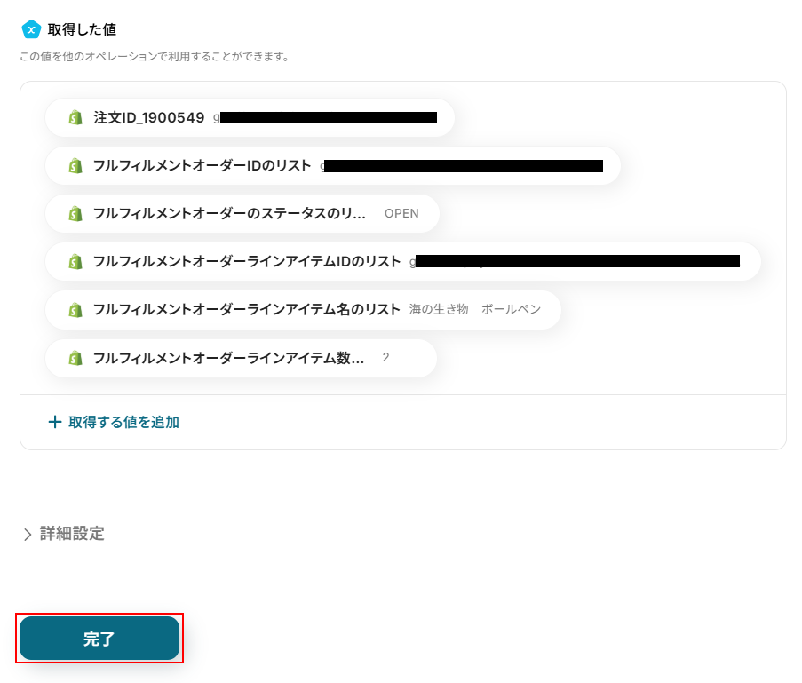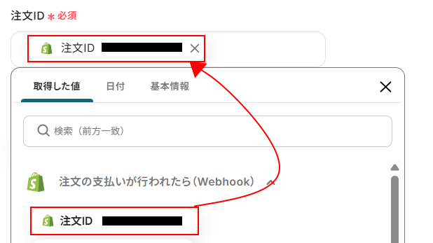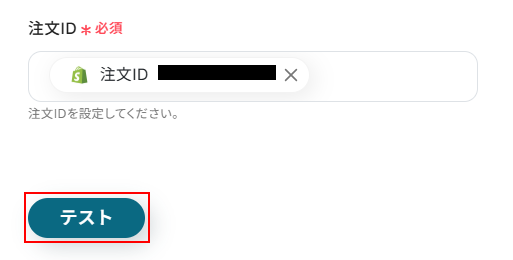 - 続いて、「注文情報を取得」のアクションを設定し、トリガーの注文の詳細情報を取得します