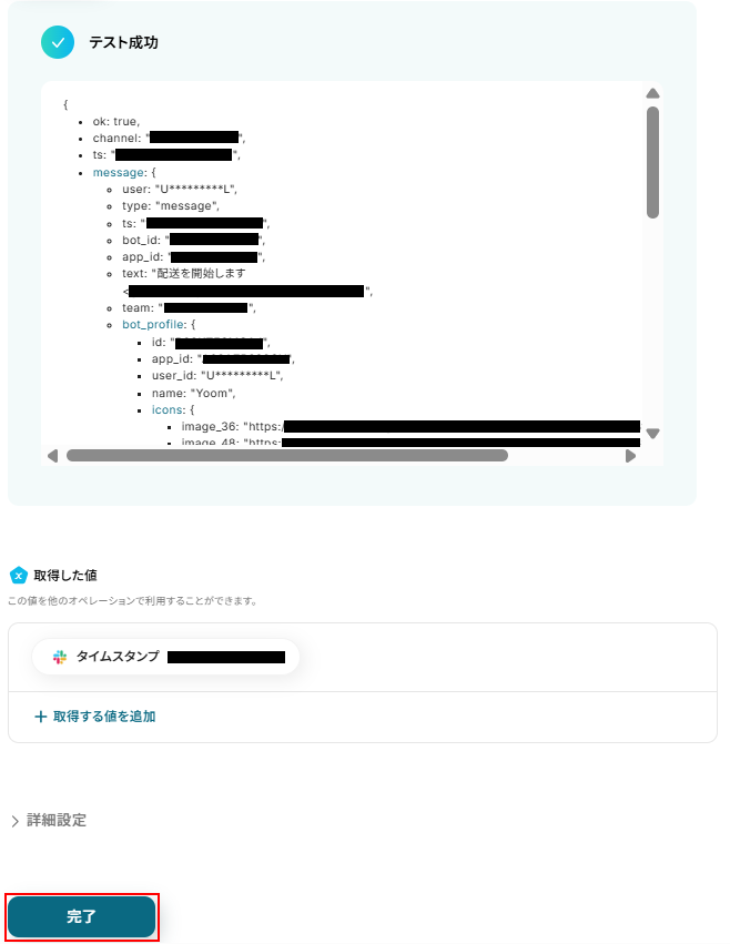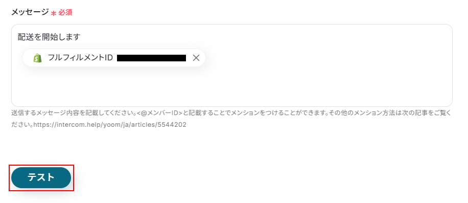 - Slackのアクションで、通知を送信したいチャンネルのIDを指定し、Shopifyから取得した情報を含めてメッセージ内容を自由にカスタマイズしてください。