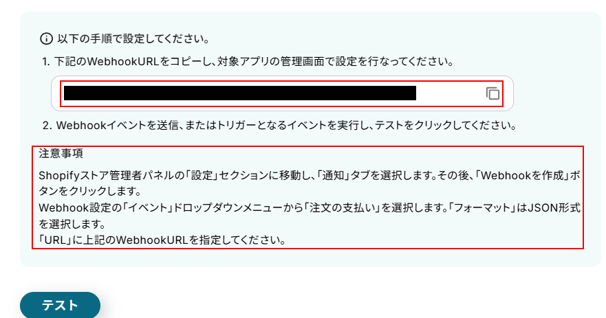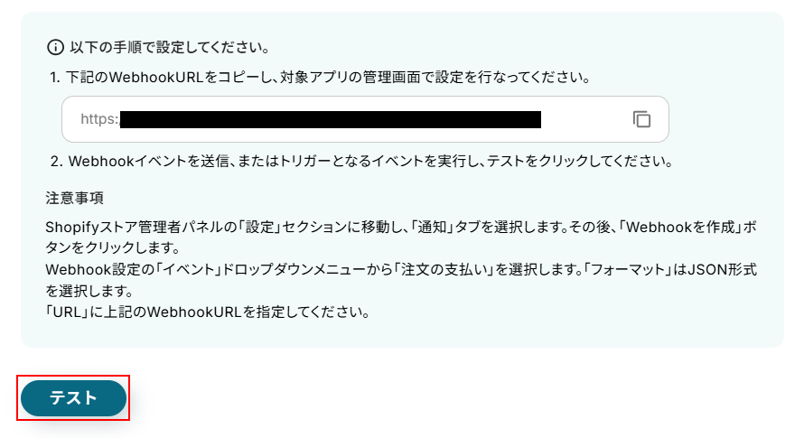 - 次に、トリガーでShopifyを選択し、「注文情報が作成されたら」というWebhookを設定します