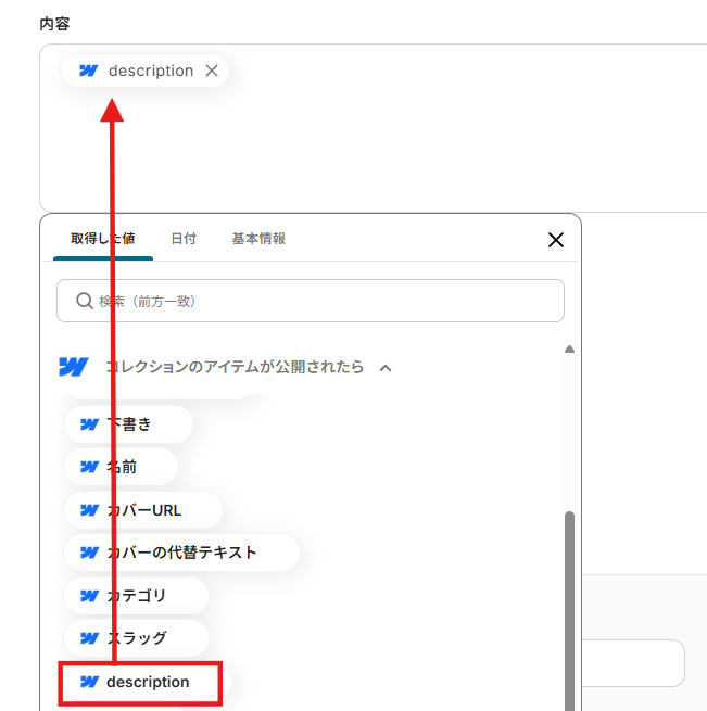 内容にはWebflowから取得した値よりdescriptionを選択し、入力します。