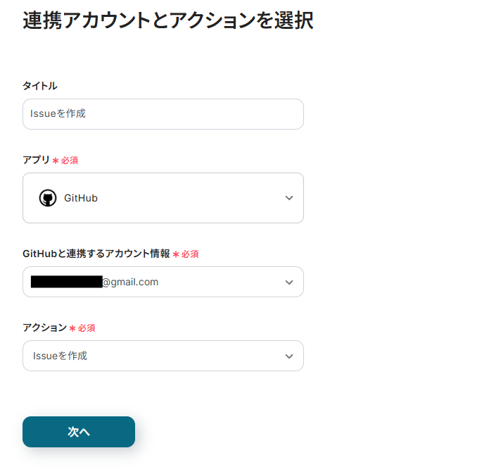 連携アカウントとアクションを選択する画面が表示されるので、今回連携するGitHubのアカウントを確認し「次へ」をクリックします。