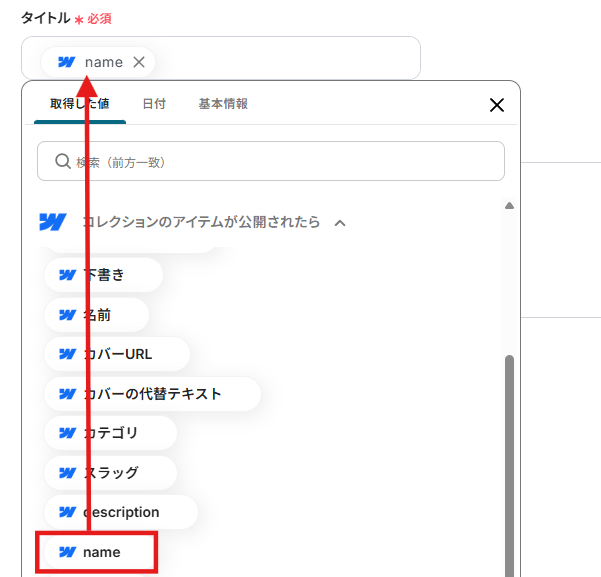 タイトルには以下のようにWebflowから取得した値から「name」を選択し、入力します。
