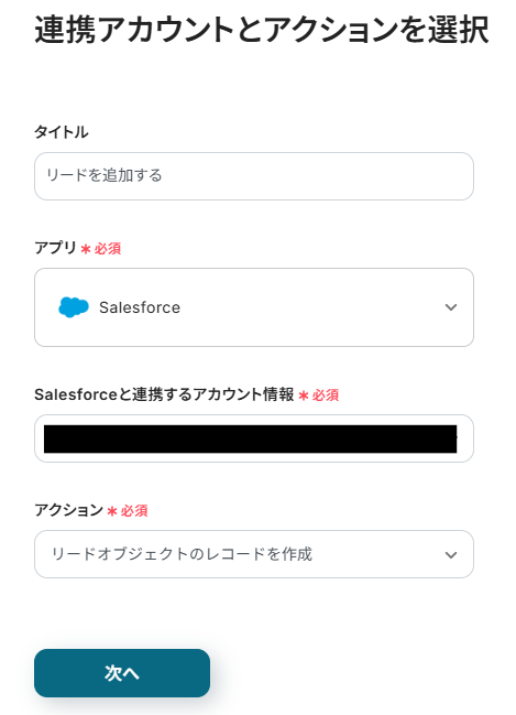 先ほどと同様にタイトルと連携するアカウント情報を任意で設定し、アクションはテンプレート通りに「レコードを追加する」のまま、下にスクロールしましょう。