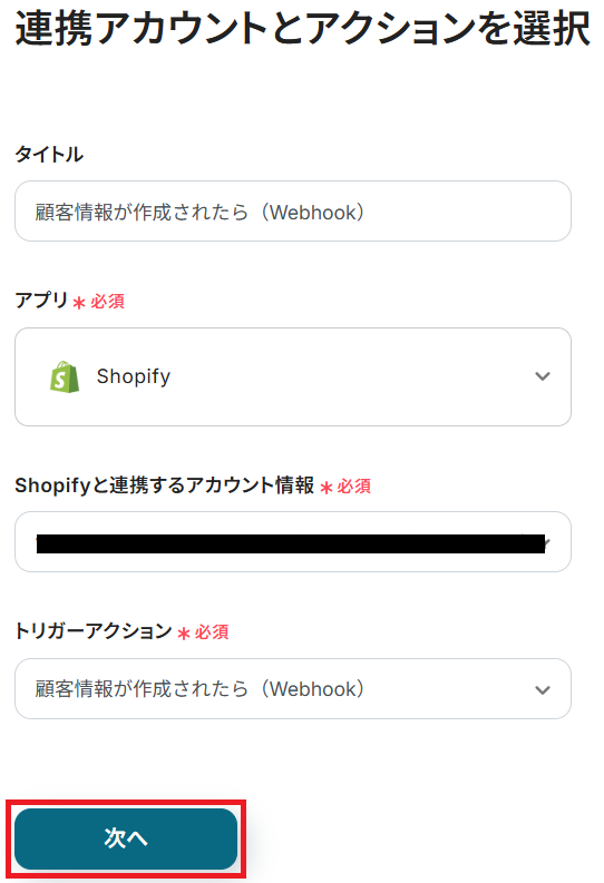 タイトルと連携するアカウント情報を任意で設定し、トリガーアクションはテンプレート通りに「顧客情報が作成されたら(Webhook)」のまま「次へ」をクリックします。