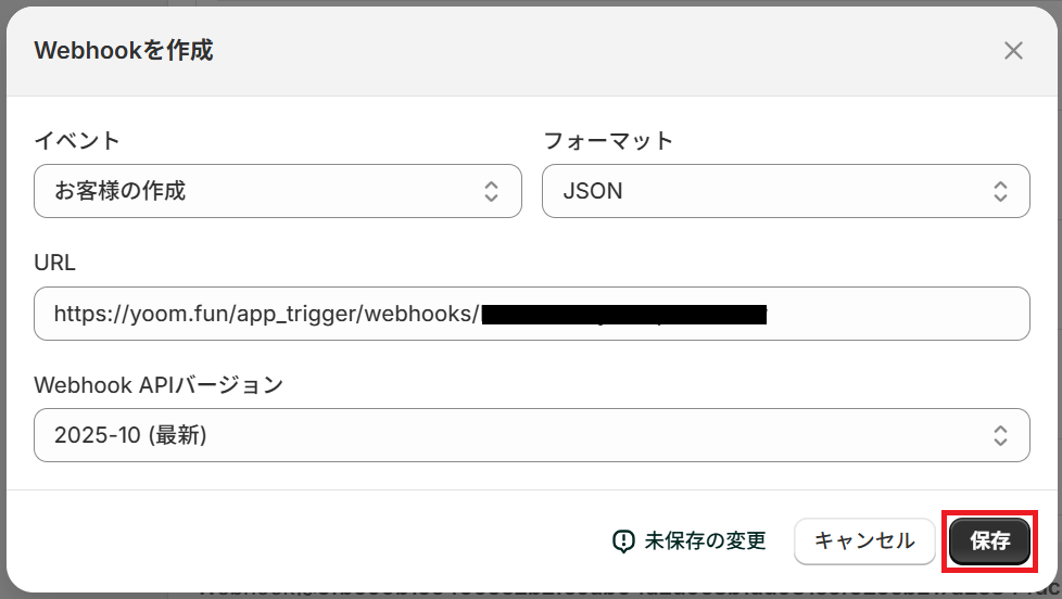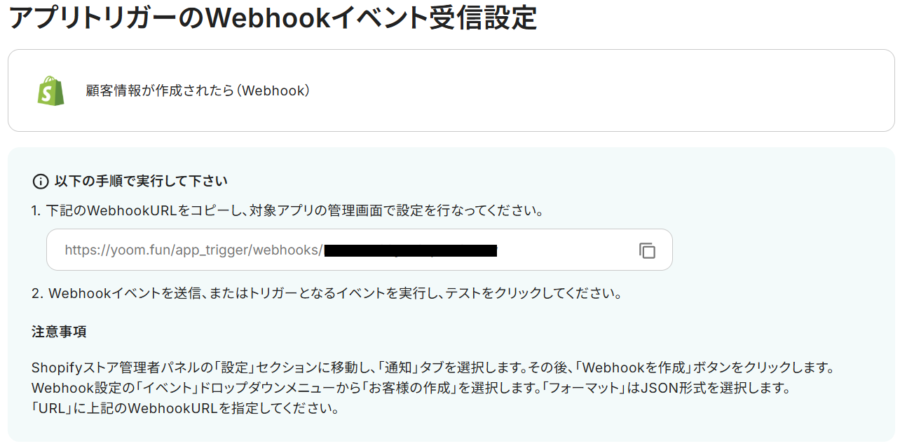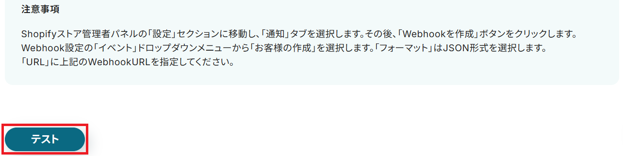 まず「注意事項」を参考に、ShopifyでWebhook設定を行ってください。