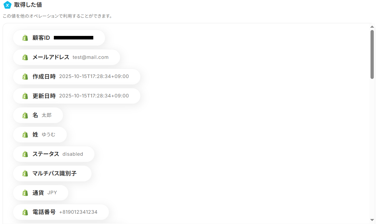 以下のように取得した値を設定することで、トリガーが実行されるたびに最新の顧客情報を反映できます。