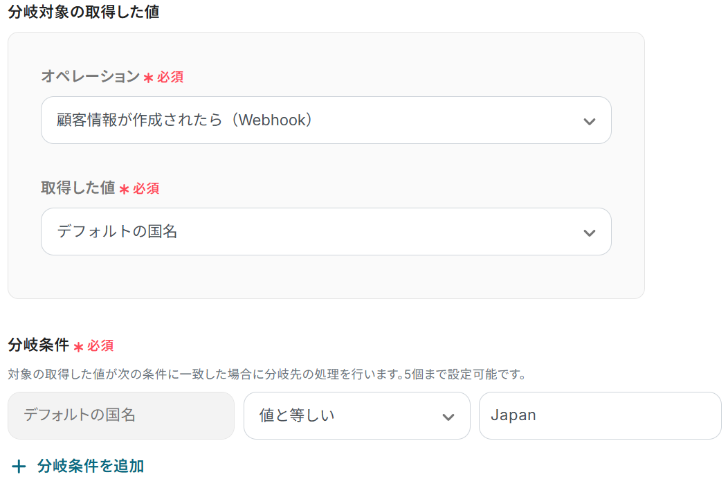 A:はい、「分岐」オペレーションを追加することで可能です。 例えば、分岐条件を「デフォルトの国名がJapanと等しい場合」に設定することで、国内の顧客のみを通知対象とすることができます。
