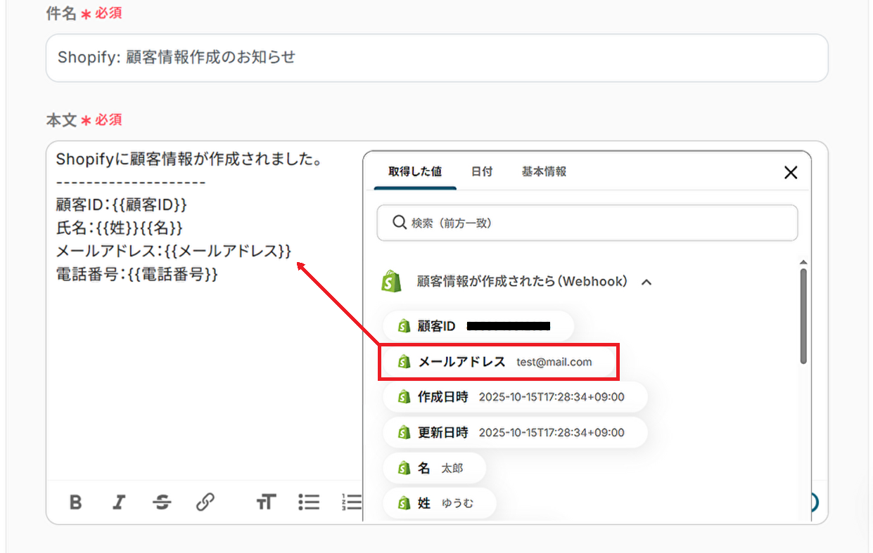 最後に件名と本文を入力しましょう。 Shopifyから取得した値などの変数や、固定の文章を組み合わせて自由にカスタマイズできます。
