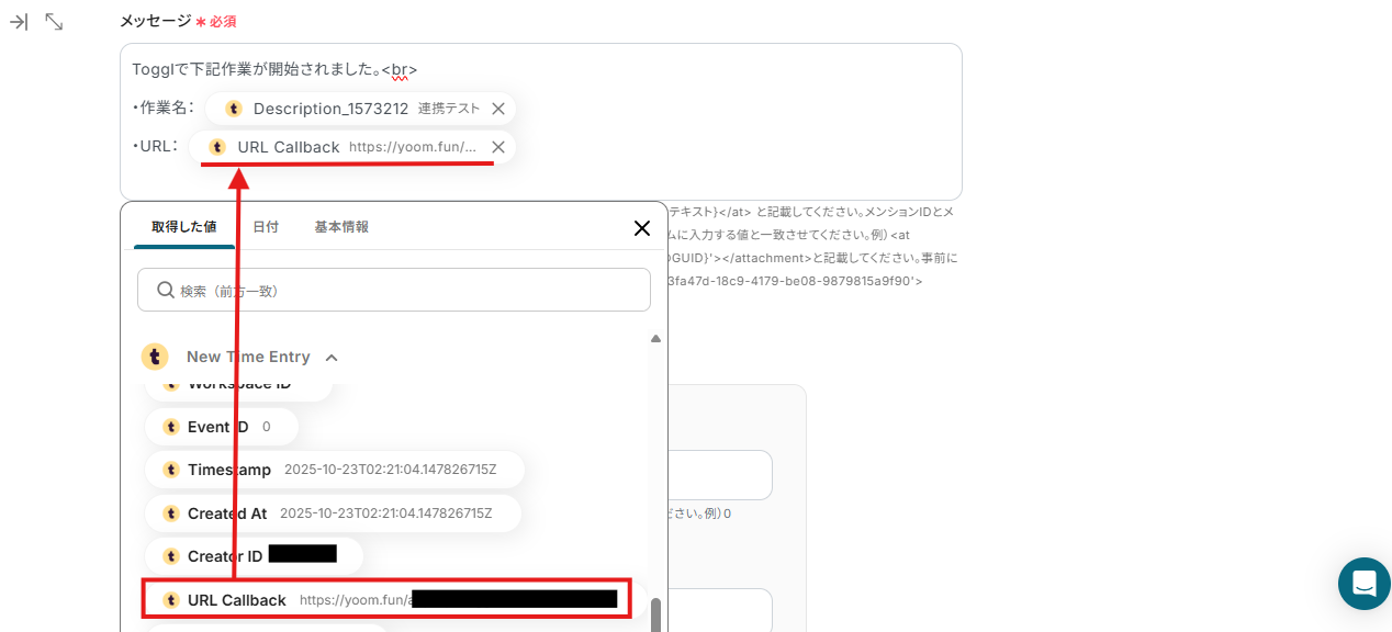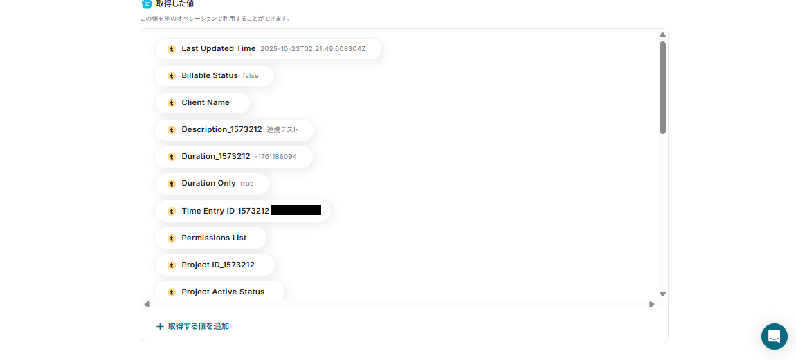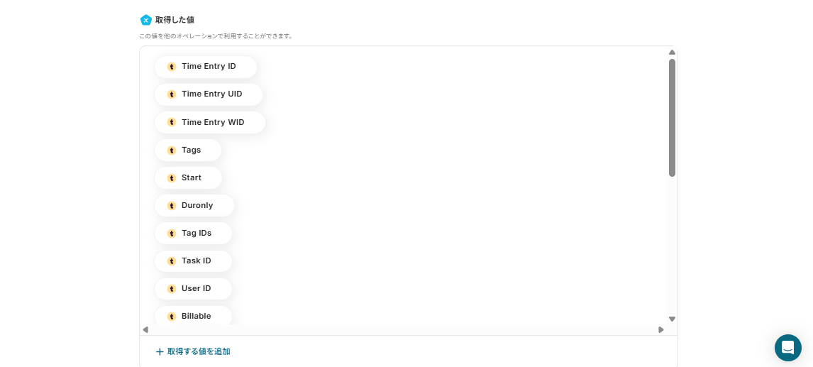 ※「取得した値」は変数となるので、TogglでTime Entryが作成される度に変動した値となります。