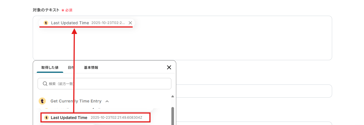 この設定により、Togglで作成したTime EntryのLast Updated Timeを抽出対象のテキストとして指定できます。