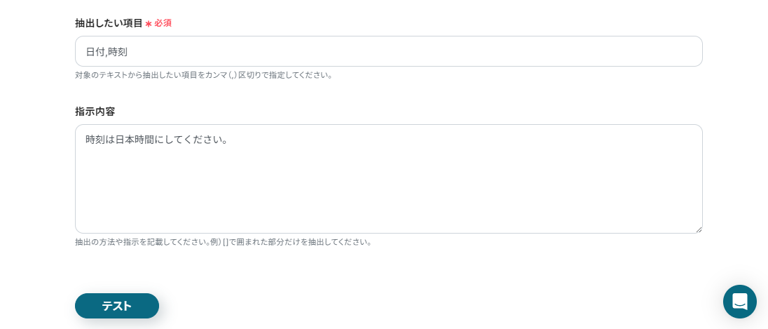 「日付,時刻」を抽出したい項目に設定し、テストを実行しましょう。