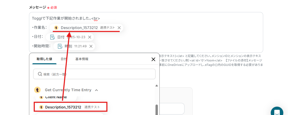例えば、下記画面のように設定するとTogglでTime Entryが作成されたら「Description」と「日付」、「時刻」を取得し自動でMicrosoft Teamsのメッセージに反映できます。