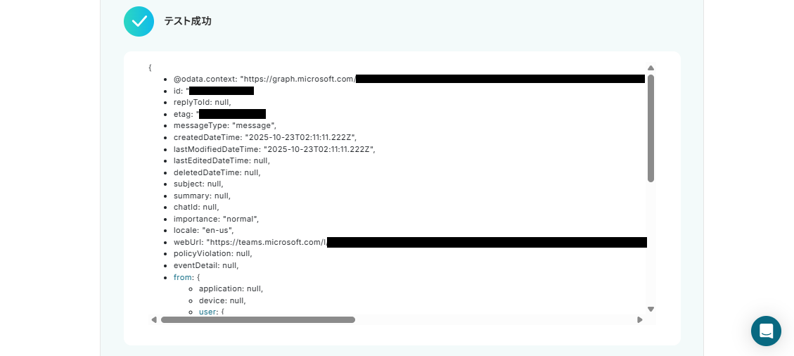 テストが成功すると、Microsoft Teamsにメッセージが自動で送信されるので確認しましょう。