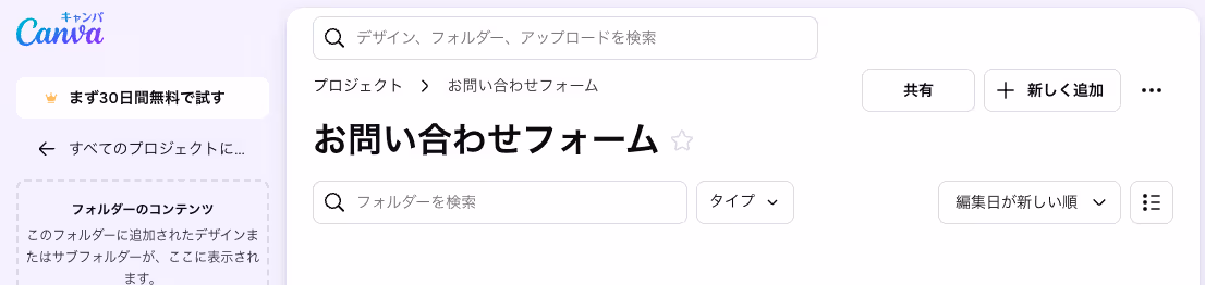 Canvaには、新規で作成するフォルダを格納するために、テスト用の親フォルダを用意しました。